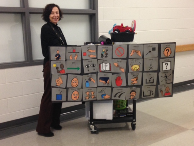 I use it for modeling and keep it nearby when I'm in the classroom- often placing my cart near the front of the classroom. Most of the teachers have made their own to use. We're working on trying to come up with 3-dimensional versions of these very hard concepts to symbolize: go, stop, more, look, like, don't like, etc. Any ideas? (And, they wouldn't have to be so big because they would be tactile?)