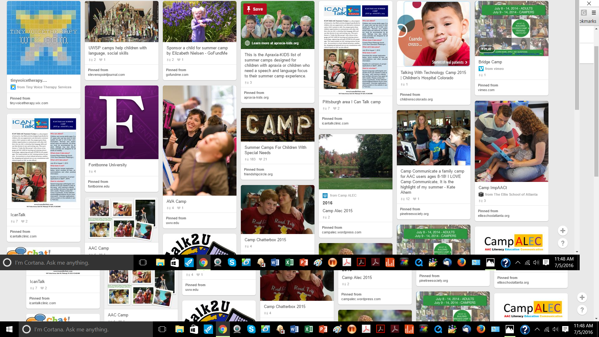 There is an AAC Camp board on Pinterest. It's interesting how much that you find out when you start searching for a Collection and Pinterest is one of my "go to" search sites now adays. Of course, you get a lot of repeats there and not a lot of text, so then I come back here to the Communication Matrix Community to see if anyone has written about a topic. I've got a few camps that I'm connected to through work and through colleagues, so I'll point out a few in specific posts.