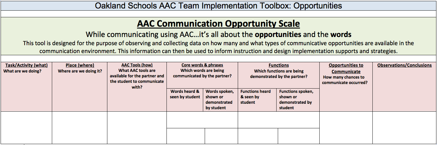 I have included the Oakland Schools "AAC Communication Opportunity Scale". It is a tool we use to assist teams in determining the communicative opportunities available in the already occurring classroom activities and routines. Teams have found the tool useful in seeing what it really looks like to apply all of the implementation strategies they have just learned about. For many is has become a useful part of their lesson planning routine.