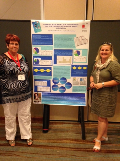 Damjana Kogovsek (right in photo) and Mihaela Vovk (left in photo) from Slovenia are attending the ISAAC Conference. They have been translating the Communication Matrix into Slovenian. They presented a poster today that compared scores on the Matrix administered by parents versus SLPs. The participants were 17 children, most of whom were preschoolers who use some form of AAC. They found that SLPs tended to score the children higher than did their parents. We discussed the possibility that parents and SLPs may have different ideas about what communication is.